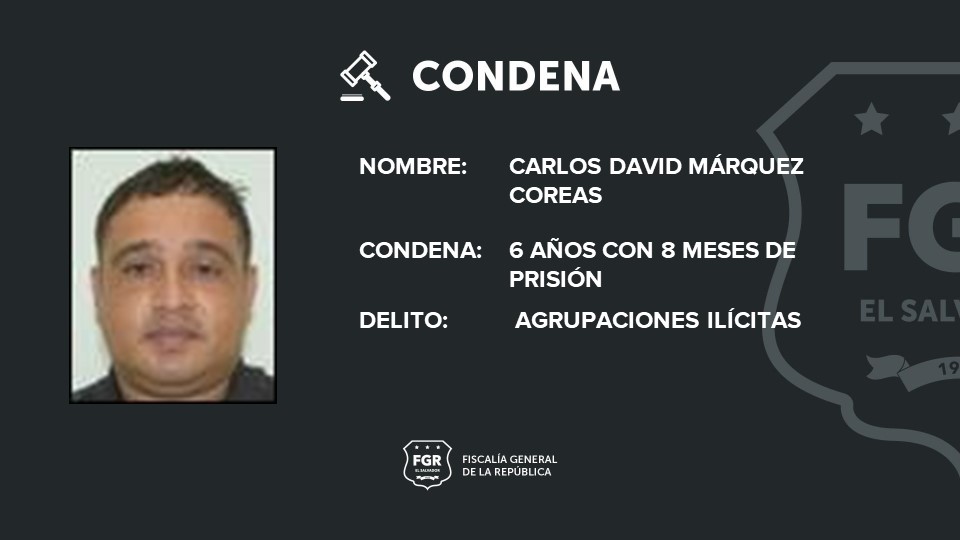 Un tercer agente policial, Carlos David Márquez Coreas que estaba destacado en la base rural de Usulután, también fue sentenciado a 6 años con 8 meses de prisión por el delito de Agrupaciones Ilícitas.
