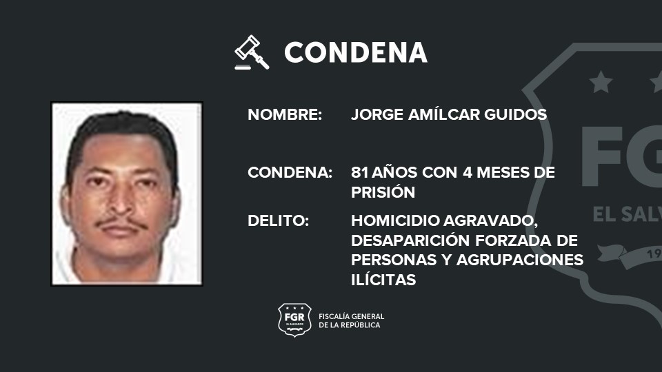 Por los mismos delitos, pero en diferentes víctimas y distinto lugar, el agente Jorge Amílcar Guidos recibió una pena de 81 años con 4 meses de cárcel por participar en la desaparición y homicidio de Andrés Alexander Guardado Ascencio y Kevin Alexander Rivera.