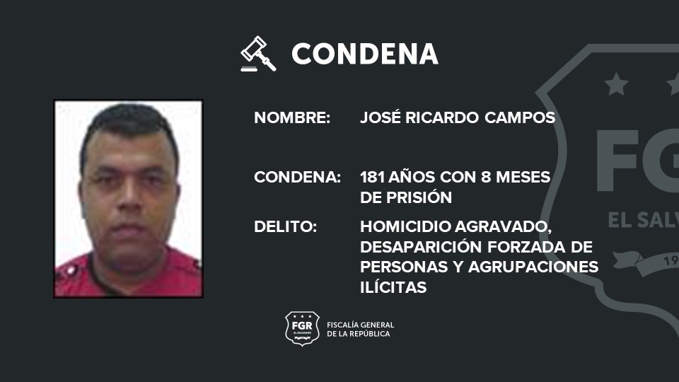En el juicio realizado en el Juzgado Primero de Sentencia de Zacatecoluca, los fiscales del caso demostraron con diferentes pruebas, entre ellas, tecnológica, testimonial y documental, que Ricardo Campos cometió los delitos de Homicidio Agravado en perjuicio de los tres jóvenes y Desaparición Forzada de Personas, así como Agrupaciones Ilícitas.