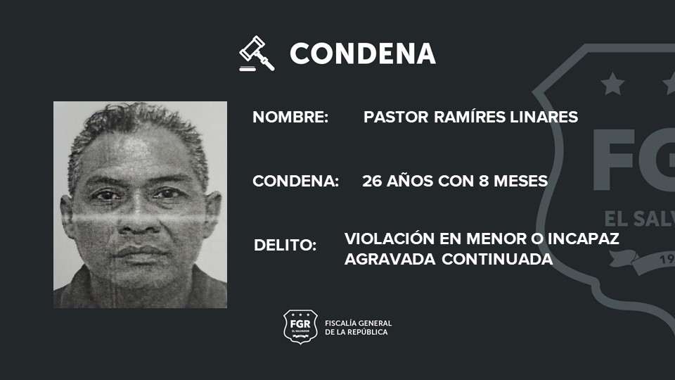 Santa Tecla. La Fiscalía General de la República (FGR) en su labor de hacer justicia para víctimas de delitos sexuales, logró una condena ejemplar de 26 años con 8 meses de prisión para Pastor Ramírez Linares, quien violó a una menor de edad desde que tenía 11 años. Las agresiones fueron cometidas desde el 2017 hasta el 2021, en el cantón Las Moritas de Lourdes, municipio de Colón, La Libertad.