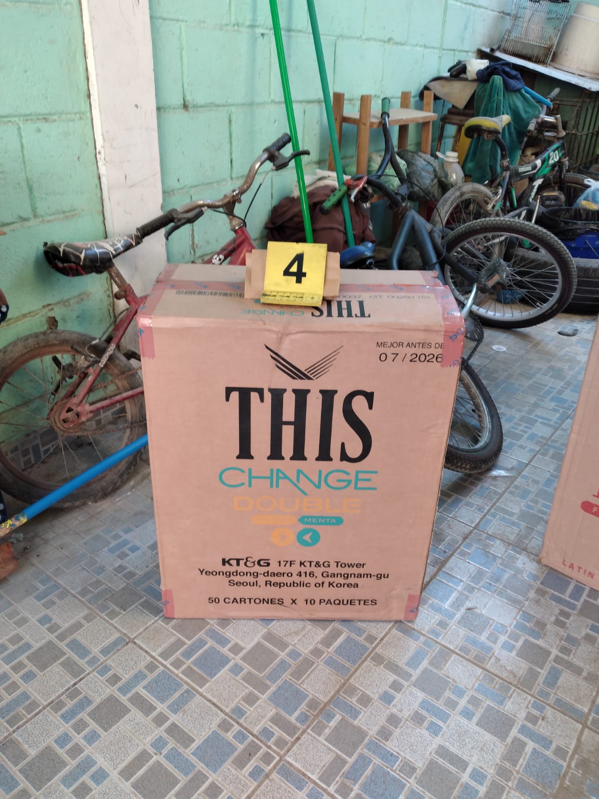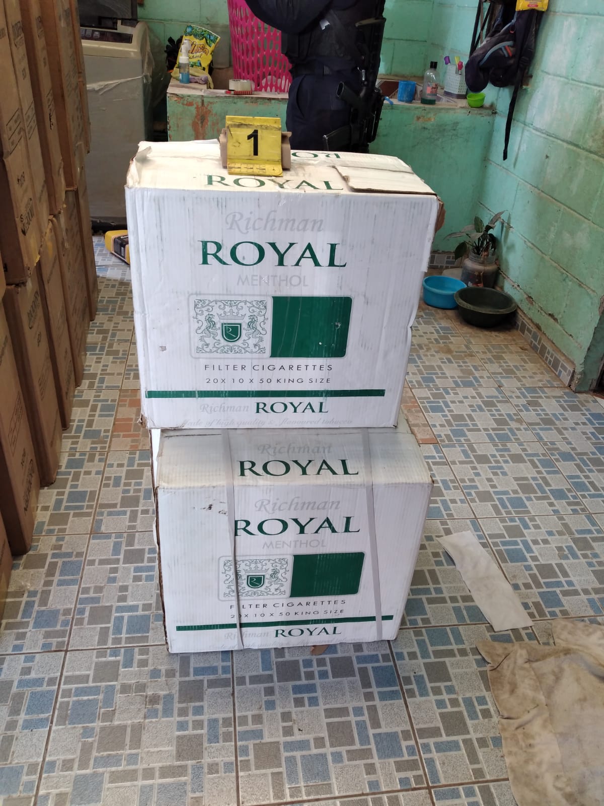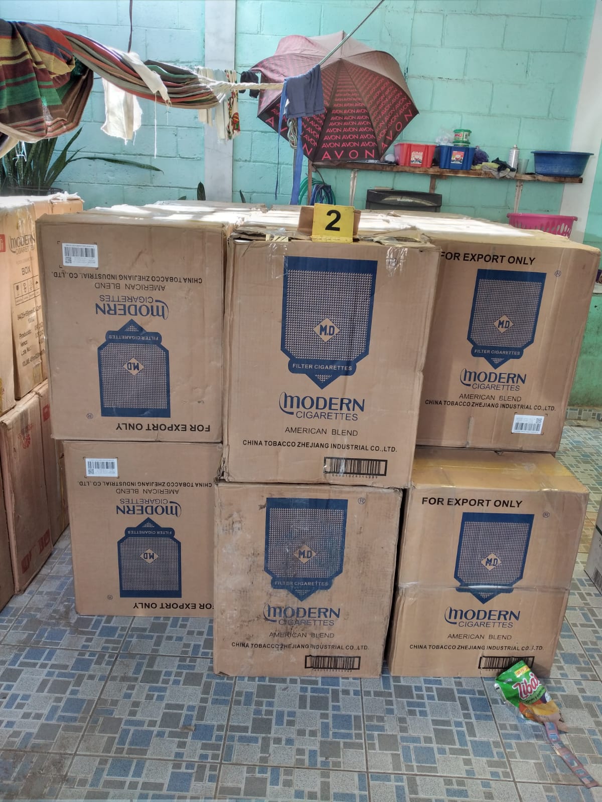 En la casa se encontró tres cajas con 50 paquetes cada una de cigarros marca Royal Mentol, de origen extranjero; 45 cajas de cartón conteniendo 50 paquetes de cigarros de la marca Modern, de origen chino; siete cajas de cartón conteniendo 50 paquetes de cigarros marca Marvel, de origen extranjero; una caja de cartón conteniendo 45 paquetes de cigarros marca This Change Double de origen coreano.