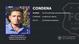 Al final del juicio, el juez validó las pruebas presentadas por la FGR por el delito de Extorsión Agravada y procedió a imponerle la condena de 16 años de cárcel y el pago de US$60.00 en concepto de responsabilidad civil.