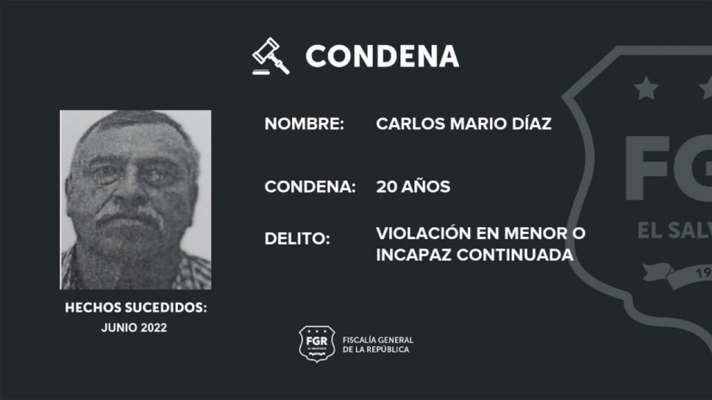 Santa Tecla, La Libertad. Carlos Mario Díaz fue condenado a 20 años de prisión y al pago $ 600.00 dólares en concepto de responsabilidad civil por haber violado a una adolescente. Los hechos sucedieron en varias ocasiones en junio del 2022 en Colón, La Libertad.