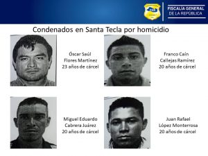 Fiscales de la Unidad de Vida de la oficina de Santa Tecla informaron que los imputados condenados son: Óscar Saúl Flores Martínez (23 años de cárcel), Miguel Eduardo Cabrera (20), Juan Rafael López (20) y Franco Caín Callejas (20).