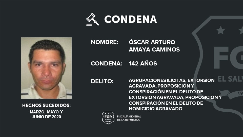 El juicio se desarrolló por varias semanas en el Tribunal Tercero contra el Crimen Organizado de Santa Ana; el juez, al conocer las pruebas presentadas por la representación fiscal, decretó la sentencia de 142 años de prisión para Óscar Arturo Amaya Caminos. Al imputado se le procesó por cuatro delitos, entre estos homicidios y extorsión.