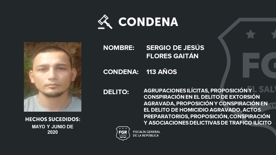 Sergio de Jesús Flores Gaitán también recibió una pena de cárcel de 113 años. Otras penas fueron impuestas a otros pandilleros, las cuales van desde los 46 hasta los tres años de prisión.