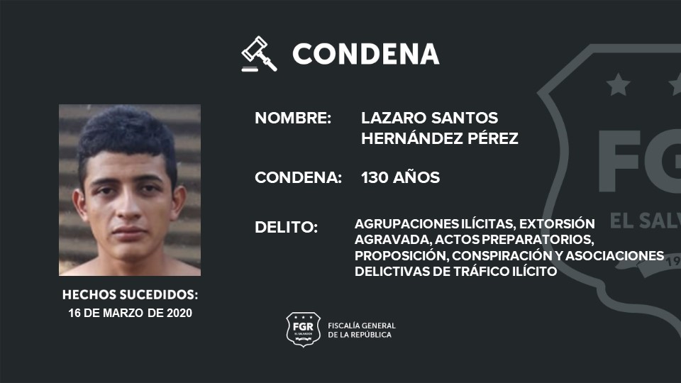 Asimismo, la Fiscalía logró que Lazaro Santos Hernández Pérez fuera condenado a 130 años de cárcel por pertenecer a una pandilla, por extorsionar y planificar el tráfico de droga.