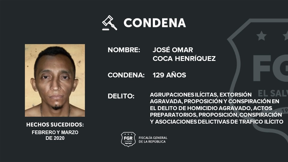 Otra sentencia impuesta es la de José Omar Coca Hernández, quien deberá permanecer en prisión 129 años por cuatro delitos entre homicidios, extorsiones, entre otros.