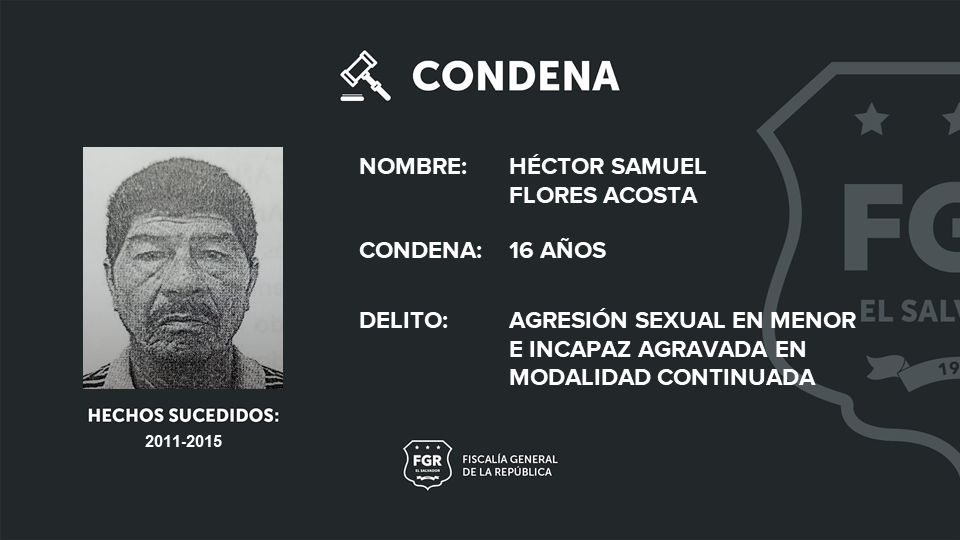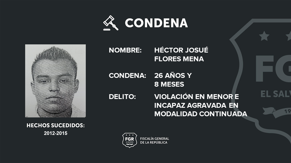 La FGR logró que Héctor Samuel Flores Acosta fuera sentenciado a 16 años de prisión por el delito de agresión sexual en menor e incapaz agravada en modalidad continuada y que Héctor Josué Flores Mena sea enviado a prisión por 26 años y 8 meses por el delito de violación en menor e incapaz agravada en modalidad continuada.