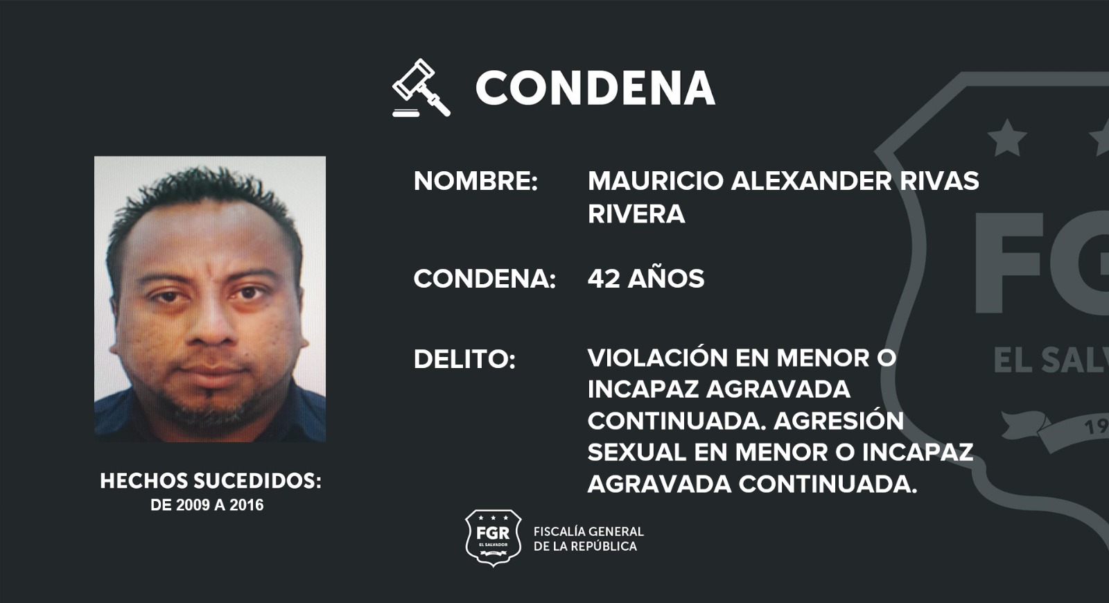 Mejicanos, San Salvador. Mauricio Alexander Rivas Rivera fue condenado a 42 años de prisión por haber violado y agredido sexualmente a una menor de edad en una residencial del municipio de San Salvador Centro, departamento de San Salvador. La condena se impuso gracias a las pruebas presentadas en juicio por la Fiscalía General de la República (FGR).
