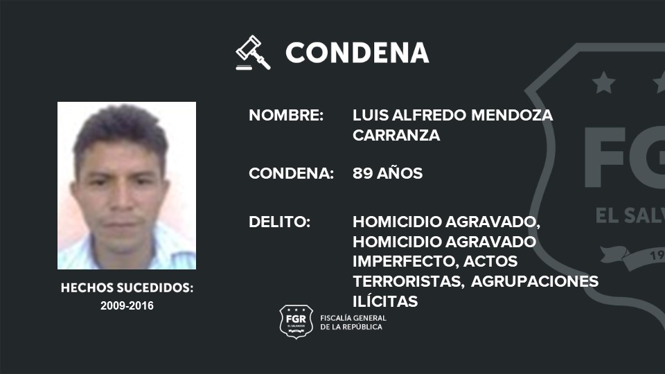 Otro de los terroristas con altas penas fue Luis Alfredo Mendoza Carranza, alias slipy, corredor de clica, quien fue condenado a 89 años de prisión y al pago de $800.00 de responsabilidad civil.