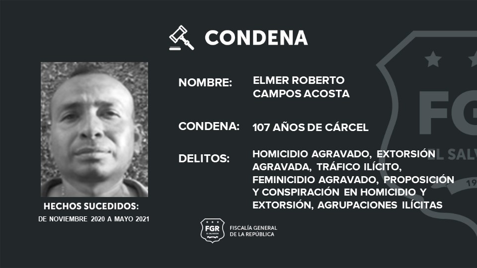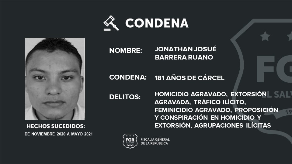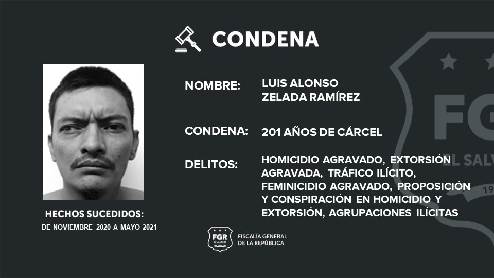 Entre los sentenciados está Luis Alonso Zelada Ramírez, alias “Silent”, quien deberá cumplir 201 años de prisión; Jonathan Josué Barrera Ruano, alias “sangriento”, fue condenado a 181 años de cárcel; Elmer Roberto Campos Acosta, alias “sapo” a 107 años de prisión.
