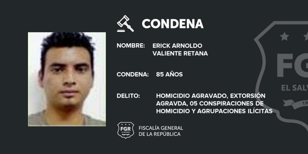 Las penas impuestas son: 123 años de cárcel para Juan Antonio Álvarez Pérez; 85 años de prisión para Erick Arnoldo Valiente Retana, y a los pandilleros Kelvin Jeovanny Rodríguez Vanegas y Kelvin Humberto Chávez Cáceres se les condenó a siete y cuatro años de cárcel, respectivamente.