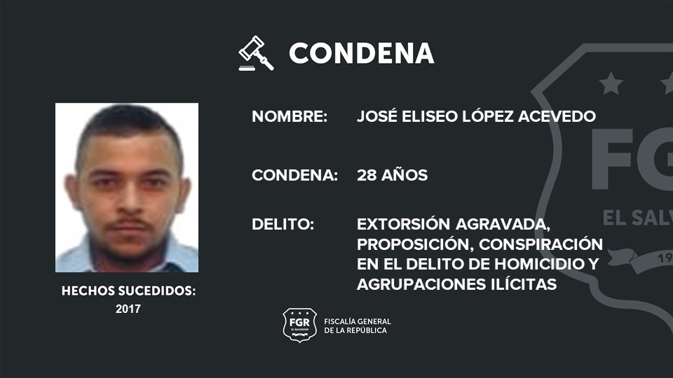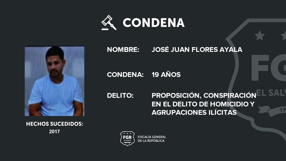 A José Douglas Oswaldo Torres Calzada, alias “Guanaco”, corredor de clica, se le impusieron 24 años por dos proposiciones en el delito de homicidio y agrupaciones ilícitas. José Juan Flores Ayala, alias “sangriento”, con el rango de homeboy se le condenó a 19 años por ser cómplice de homicidios y agrupaciones ilícitas.