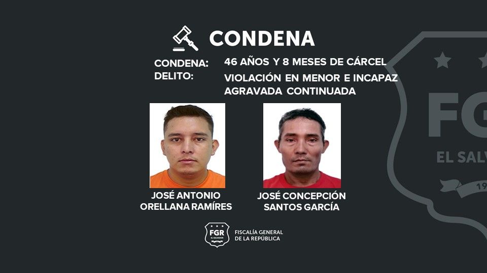 Chalatenango. Una vez más, la Fiscalía General de la República (FGR) logró justicia para dos menores que fueron víctimas de violación e hizo posible que los agresores, José Concepción Santos García y José Antonio Orellana Ramírez, fueran condenados a 46 años y 8 meses de prisión.