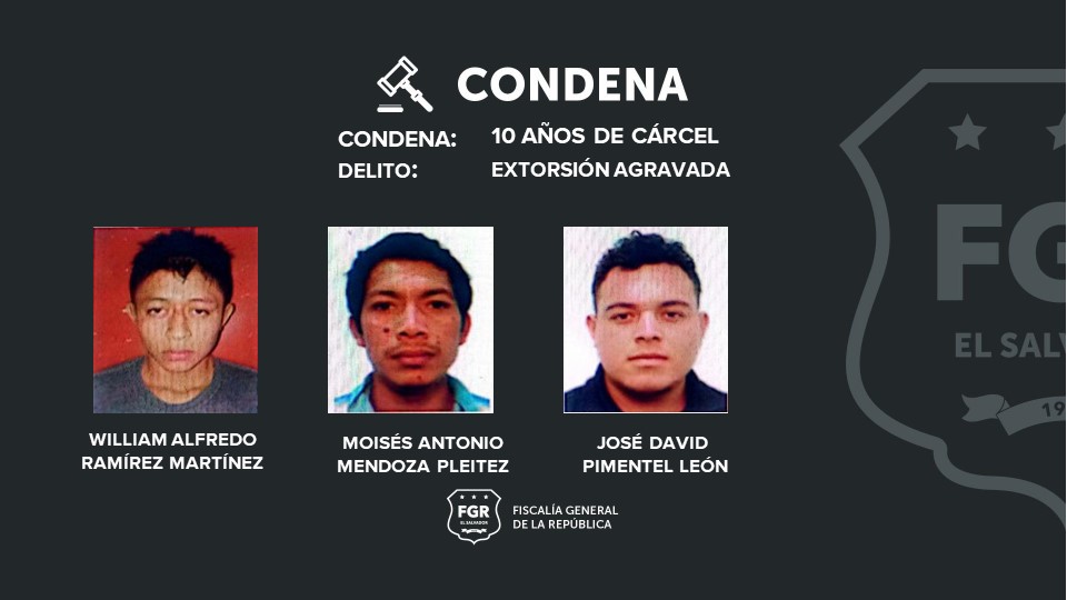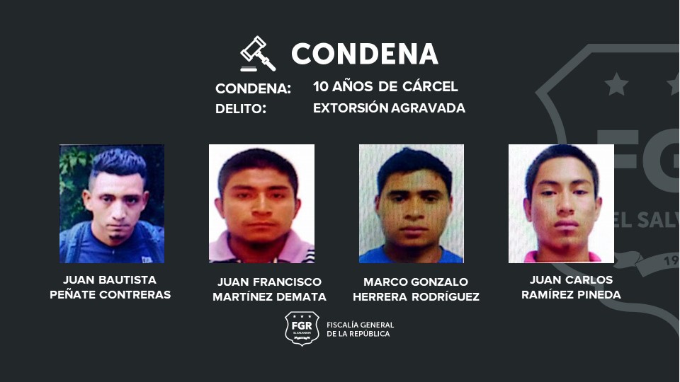 Ahuachapán. José David Pimentel León, Juan Bautista Peñate Contreras, Marco Gonzalo Herrera Rodríguez, Moisés Antonio Mendoza Pleitez, William Alfredo Ramírez Martínez, Juan Francisco Martínez Demata y Juan Carlos Ramírez Pineda son los siete condenados a 10 años de prisión por el delito de extorsión agravada.