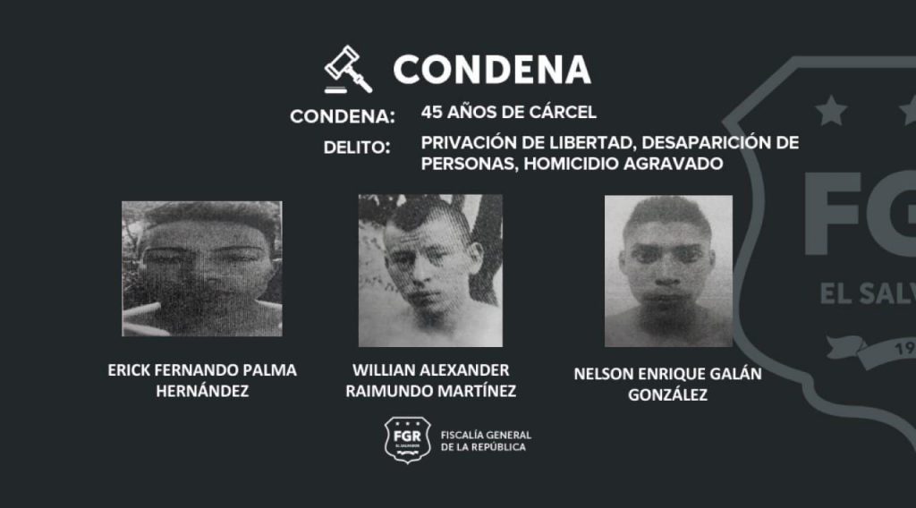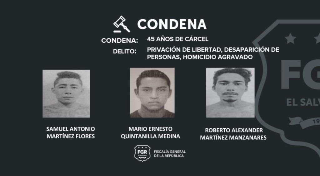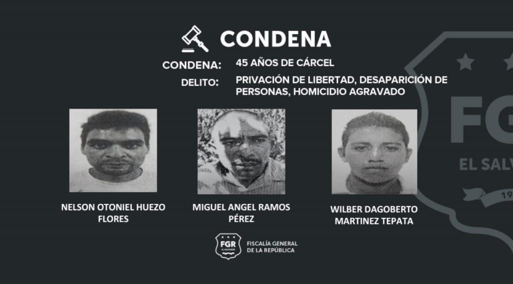 Con abundantes pruebas, la Fiscalía logró que se condenara a: Nelson Otoniel Huezo Flores, Miguel Ángel Ramos Pérez, Wilber Dagoberto Martínez Tepata, Erick Fernando Palma Hernández, William Alexander Raimundo Martínez, Nelson Enrique Galán González, Samuel Antonio Martínez Flores, Ernesto Quintanilla Medina y Roberto Alexander Martínez Manzanares. A todos se les atribuye el delito de Privación de Libertad, Desaparición de Personas y Homicidio Agravado.