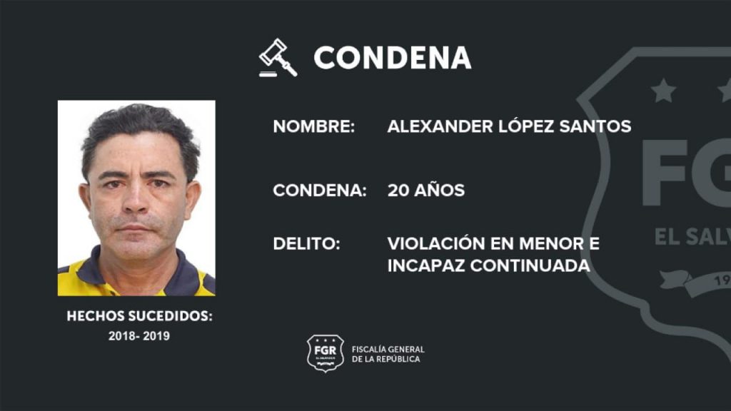 Chalatenango.  Una vez más, la Fiscalía General de la República (FGR) hizo justicia para víctimas de delitos sexuales y logró 20 años de prisión para Alexander López Santos por el delito de violación en menor e incapaz continuada, en perjuicio de un niño de 8 años de edad.