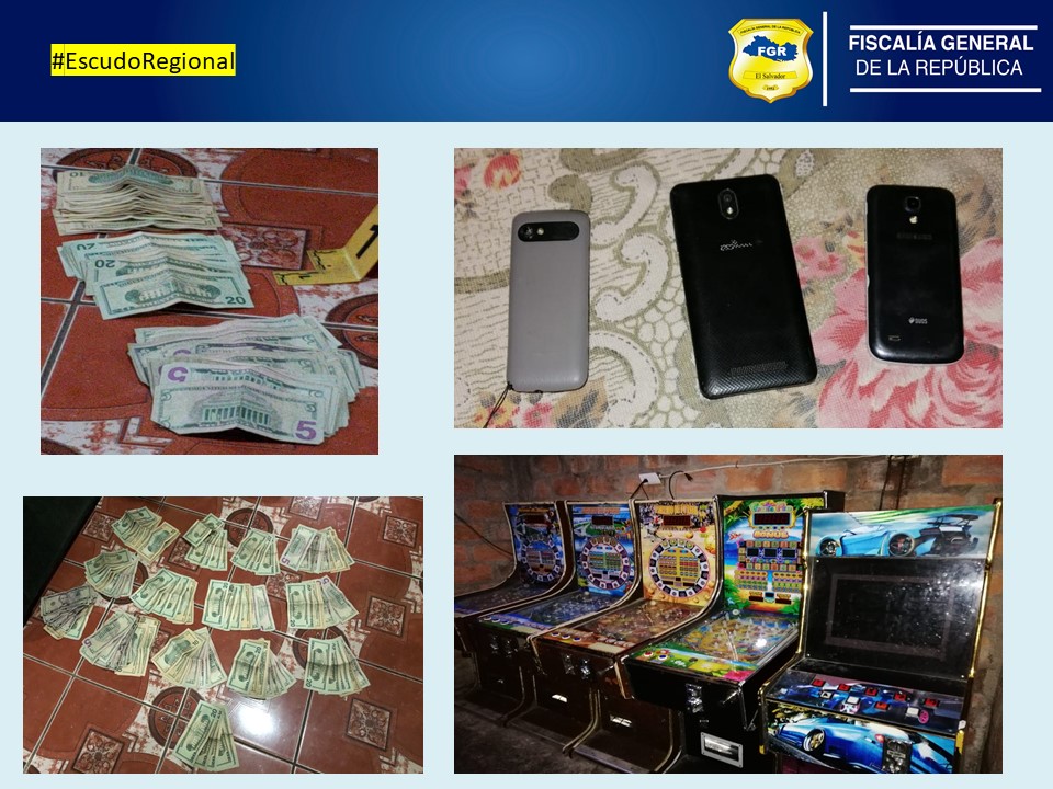 Mientras que la oficina de Cojutepeque informa de la captura por los delitos de Extorsión Agravada, Limitación Ilegal a la Libertad de Circulación y Robo, de nueve miembros de la MS, en el municipio de San Rafael Cedros; durante los registros y allanamientos se incautó USD$ 1,400.00 en efectivo, 8 máquinas de juegos electrónicos conocidas como traga peras, así como 11 celulares.