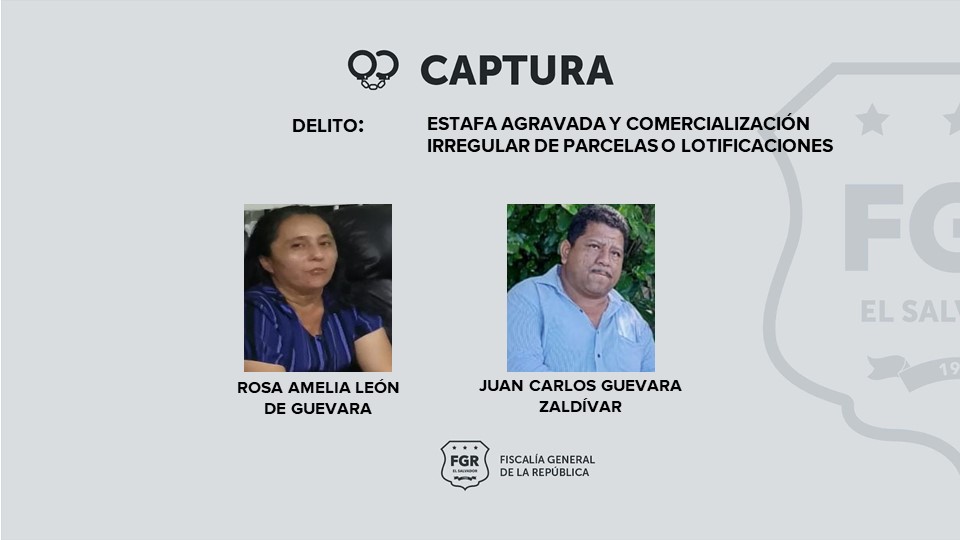 San Juan Opico. La Fiscalía General de la República (FGR) presentó requerimiento contra Juan Carlos Guevara Zaldivar y Rosa Amelia León de Guevara, a quienes se les acusa de haber cometido los delitos de estafa agravada y comercialización irregular de parcelas o lotificaciones. La diligencia se presentó en el Juzgado de Paz de San Juan Opico, La Libertad.