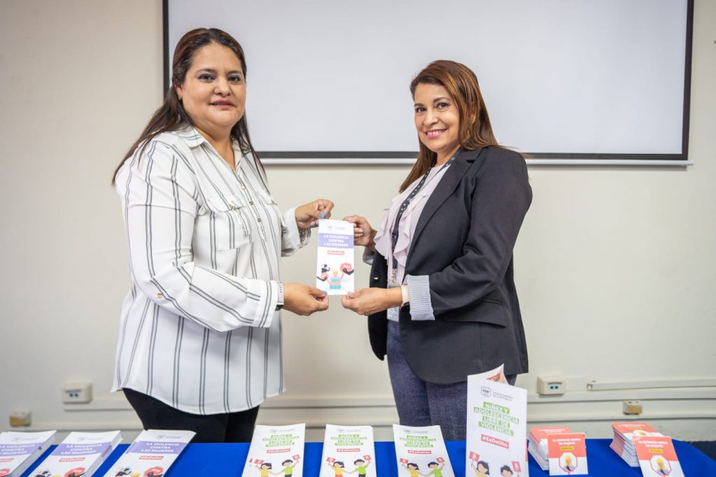 El material informativo fue recibido por la Fiscal Adjunta para la Mujer, Niñez, Adolescencia y otros Grupos Vulnerables, Marina de Ortega, y la directora de la Unidad de Atención Especializada para la Mujer, Niñez, Adolescencia y Otros Grupos Vulnerables (UAEMNA), Marleny Recinos.