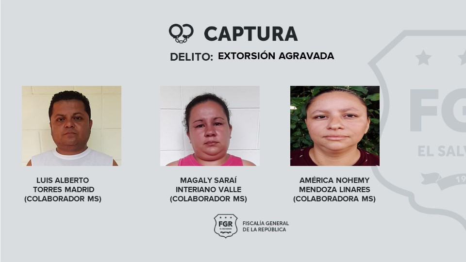 Entre los detenidos se encuentran tres colaboradores de la MS, América Nohemy Mendoza Linares, Luis Alberto Torres Madrid y Magaly Saraí Interiano Valle, a quienes se les atribuye el delito de Extorsión Agravada. Los imputados exigían a su víctima $300 dólares a cambio de no secuestrar a sus familiares o hacerles daño.