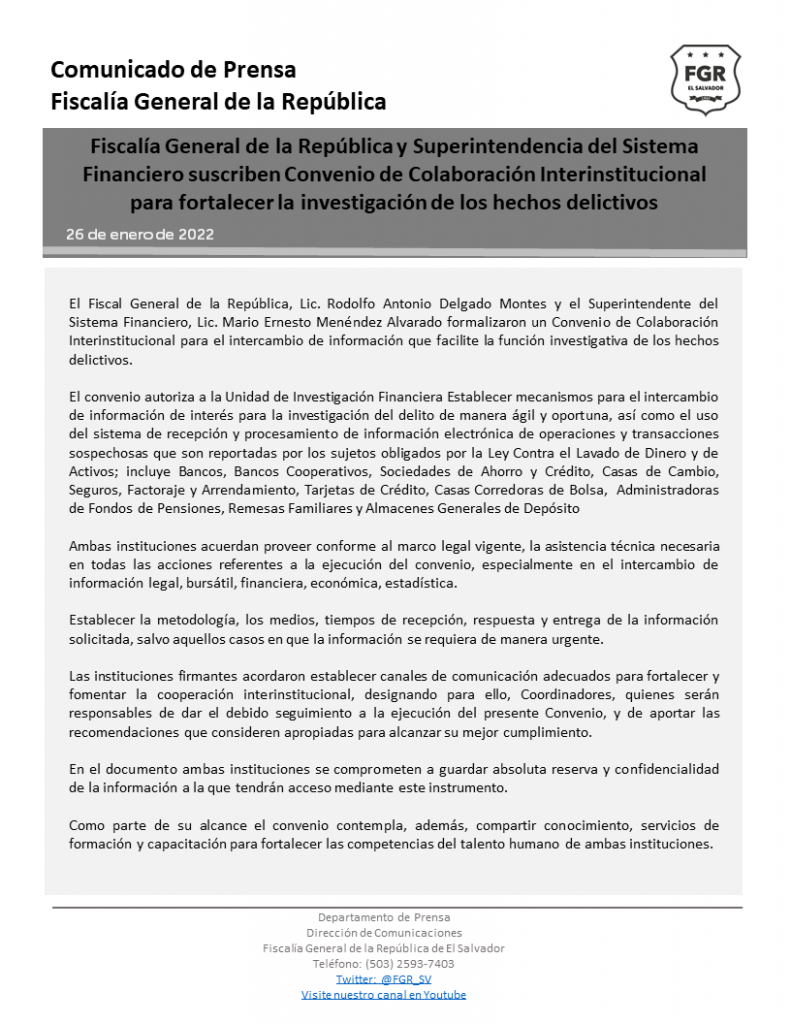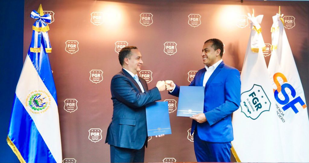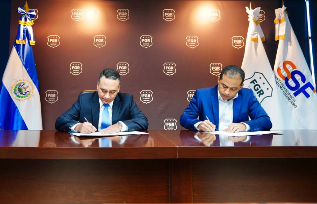 El Fiscal General de la República, Lic. Rodolfo Antonio Delgado Montes y el Superintendente del Sistema Financiero, Lic. Mario Ernesto Menéndez Alvarado formalizaron un Convenio de Colaboración Interinstitucional para el intercambio de información que facilite la función investigativa de los hechos delictivos.
