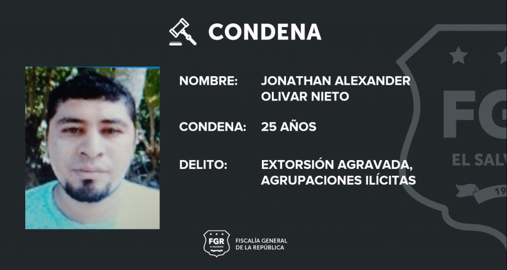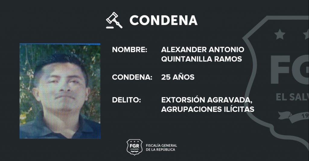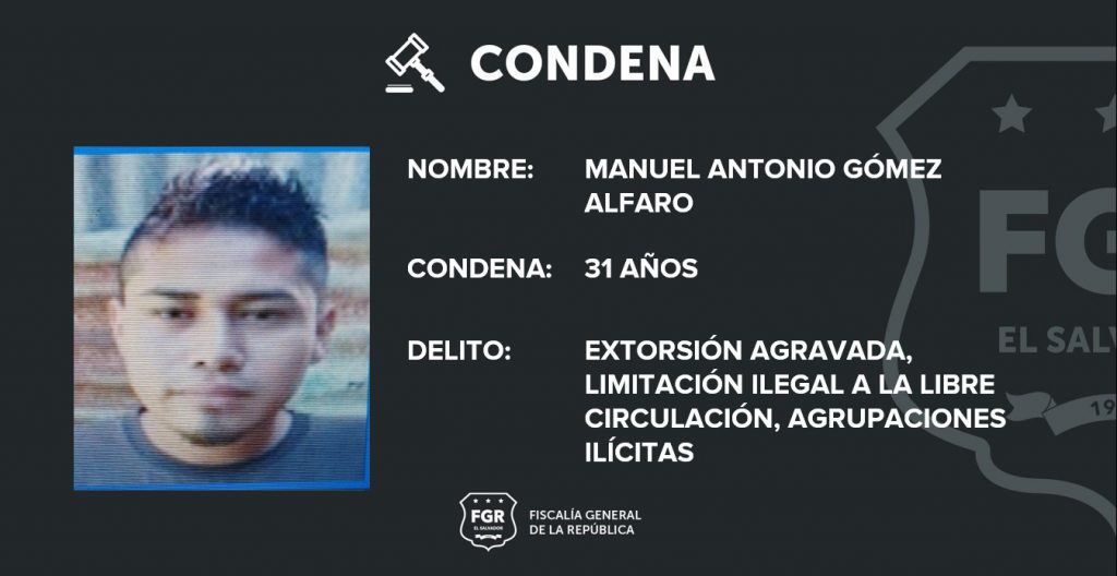 Para Manuel Antonio Gómez, la Fiscalía logró una condena de 31 años de cárcel por Extorsión, Limitación Ilegal a la Libre Circulación y Agrupaciones Ilícitas. Además, Jonatan Alexander Olivar y Alexander Antonio Quintanilla fueron sentenciados a 25 años de cárcel por Extorsión y Agrupaciones Ilícitas.