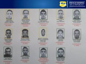 Las condenas y los sujetos pueden individualizarse de la siguiente manera: Julio Adiel Olano Galicia 109 años de prisión, Rene Alexander Vásquez, condenado a 69 años, William Eliazar Cruz Mancía, 64 años de cárcel, Hamilton Joel Lemus 25 años, Carlos Alberto Cárdenas 20 años, Emerson Samuel Díaz Vargas, 17 años cuatro meses de prisión, Manuel Alexander Villalta, 17 años cuatro meses y Ramón Enrique Reyes Merino, fue condenado a 17 años cuatro meses de prisión.
