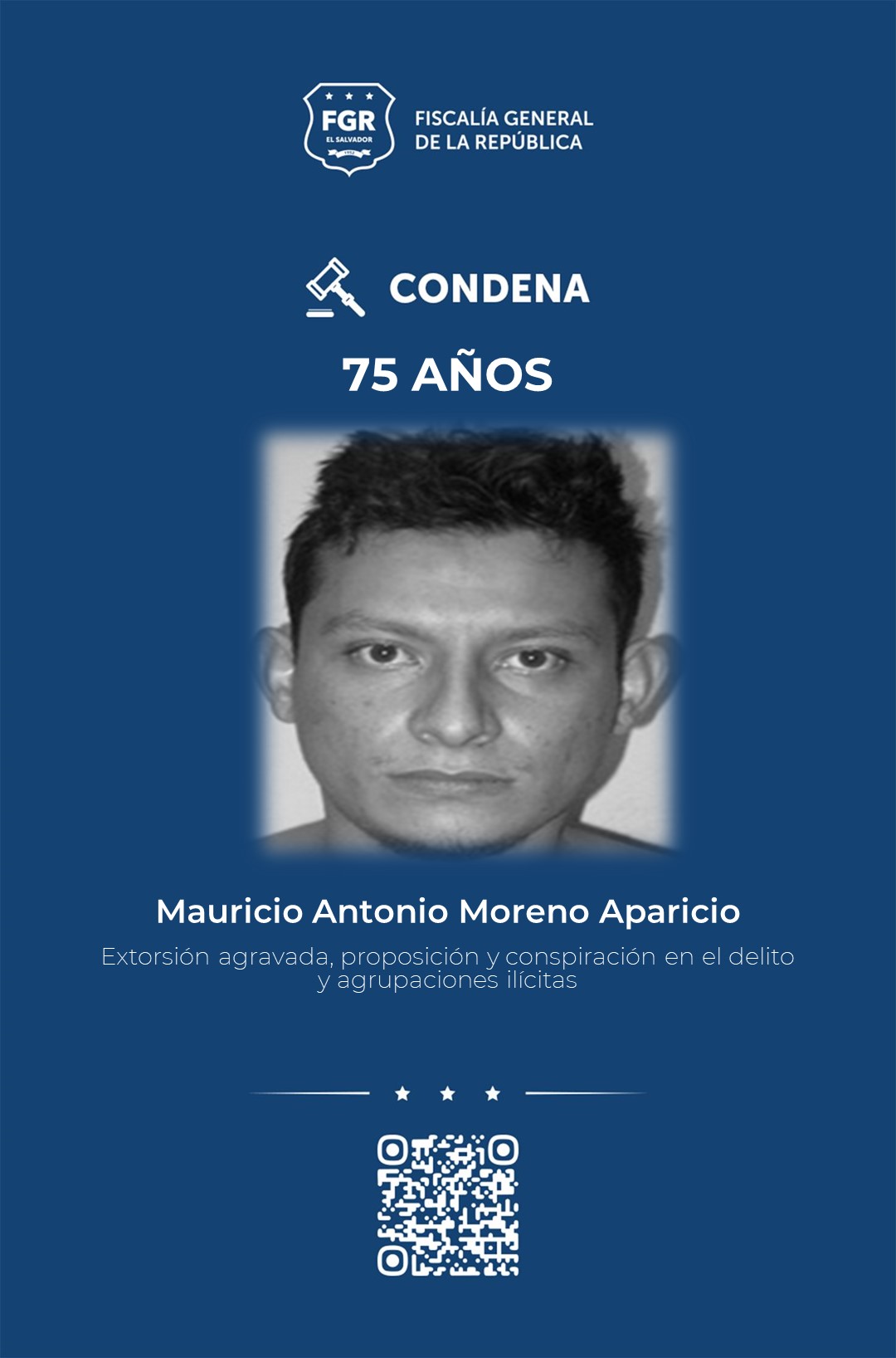 Mauricio Antonio Moreno Aparicio, alias “Droopy”, -en calidad de reo ausente- recibió 75 años de cárcel por dos extorsiones agravadas, tres proposiciones y conspiraciones en el delito de homicidio agravado y agrupaciones ilícitas.