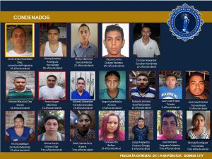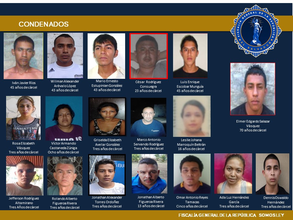 El jefe Fiscal destacó las condenas de José Jacobo Guardado Díaz, corredor de programa a 43 años de cárcel; Héctor Emilio Chávez Pacheco, 145 años; Henry Antonio Rodríguez Hernández, 95 años; Elmer Edgardo Salazar Vásquez, 70 años; Iván Javier Ríos, Luis Enrique Escobar Munguía, ambos a 45 años.