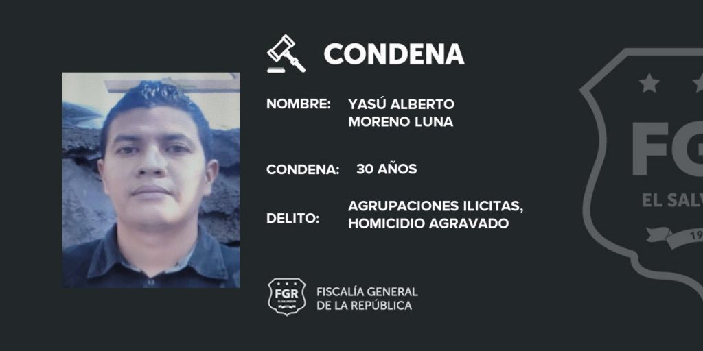 Además, en el juicio desarrollado en el Juzgado Especializado de Sentencia de San Salvador se evidenció que Yasú Alberto Moreno Luna, alias villano, es culpable de Homicidio Agravado y Agrupaciones Ilícitas, por los cuales tendrá que pagar 30 años de cárcel.