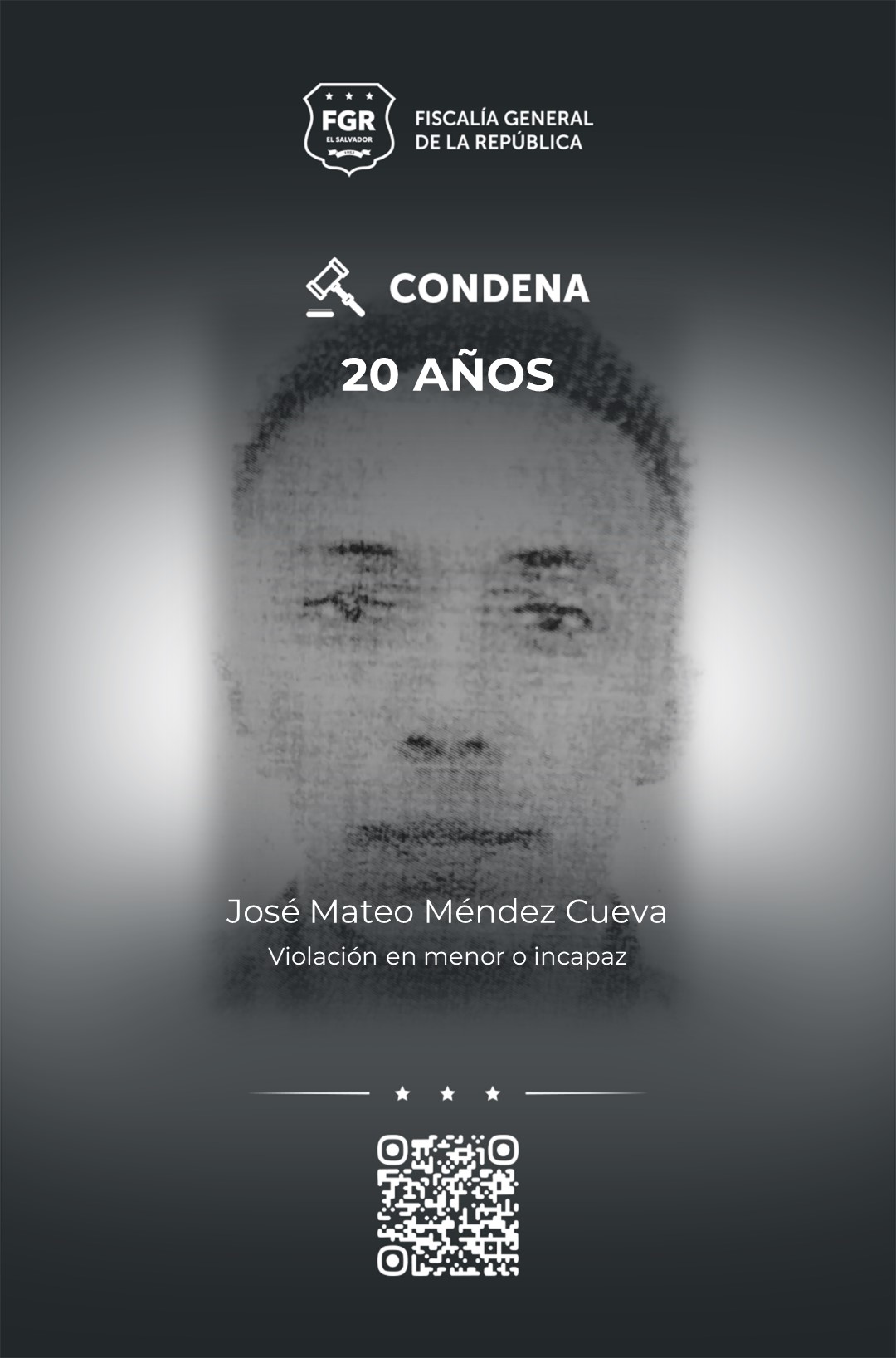 Mientras que  José Mateo Méndez Cuevas, fue condenado a 20 años de cárcel, por violar a una menor de edad en el cantón La Ceiba, del distrito de Ereguayquin, Usulután.