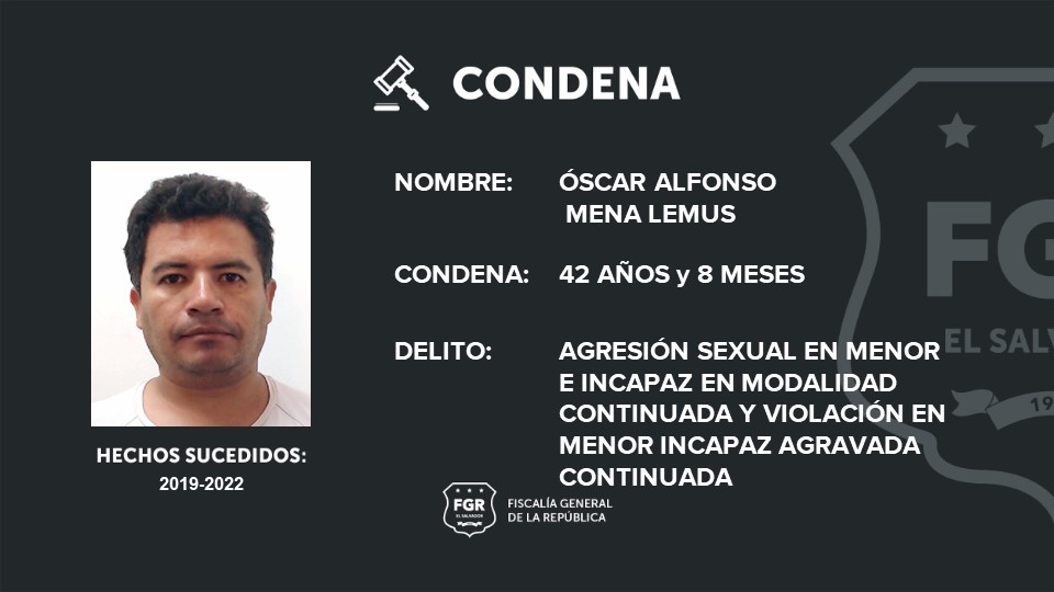 Santa Ana. Óscar Alfonso Mena Lemus fue condenado a 42 años de cárcel por haber violado y agredido sexualmente a una menor de edad. Según las investigaciones, este sujeto se valió de la confianza que existía con la familia de la menor para llegar a la casa y cometer los abusos. Los hechos ocurrieron entre el 2019 y 2022, en Santa Ana.