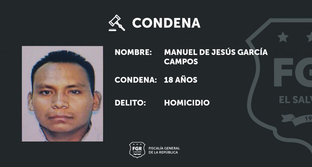 Cojutepeque, Cuscatlán. Manuel de Jesús García Campos fue condenado a 18 años de prisión, gracias a las contundentes pruebas presentadas por los fiscales, las cuales evidenciaron que el imputado mató a otra persona por rencillas personales.