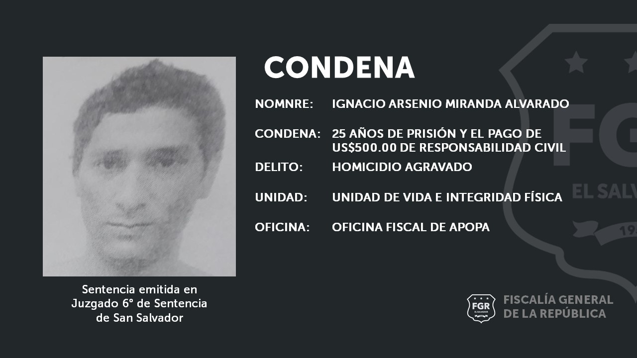 Apopa. Fiscales de la Unidad de Delitos Relativos a la Vida e Integridad Física de Apopa lograron la condena de 25 años de cárcel en contra de Ignacio Arsenio Miranda Alvarado, miembro de la MS, por el delito de Homicidio Agravado en perjuicio del señor Miguel Antonio Pinto Chen, hecho ocurrido el 20 de diciembre de 2018, en el Barrio El Centro del municipio de Guazapa, departamento de San Salvador.