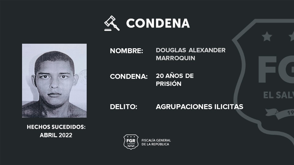 Ilopango, San Salvador Este. Douglas Alexander Marroquín fue uno de los primeros pandilleros del Barrio 18 capturados en abril de 2022 gracias a la implementación del Régimen de Excepción. Este día, la Fiscalía General de la República (FGR) logró que sea condenado a 20 años de prisión por el delito de agrupaciones ilícitas.