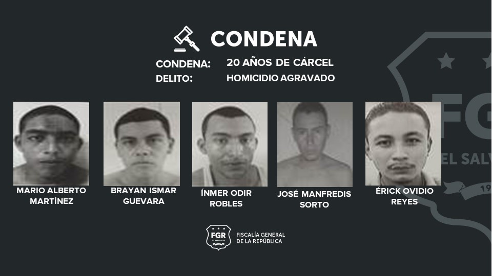Los sentenciados son: Mario Alberto Martínez Machado, alias piocha; Ínmer Odir Torres Robles, alias camilo; Érick Ovidio Reyes Avelar, alias pavana; José Manfredy Hernández Sorto, alias magaleno, y Bryan Ismar Guevara Rubio, alias pirruris, que se encuentra en rebeldía.