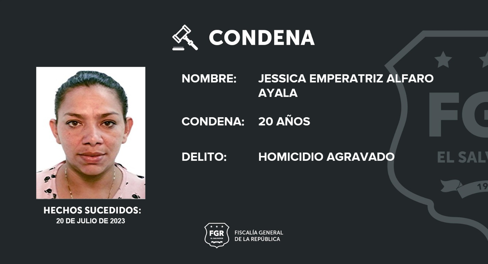 San Vicente. La Fiscalía General de la República (FGR) logró que Jessica Emperatriz Alfaro Ayala sea condenada a 20 años de prisión, por el homicidio agravado de su expareja.