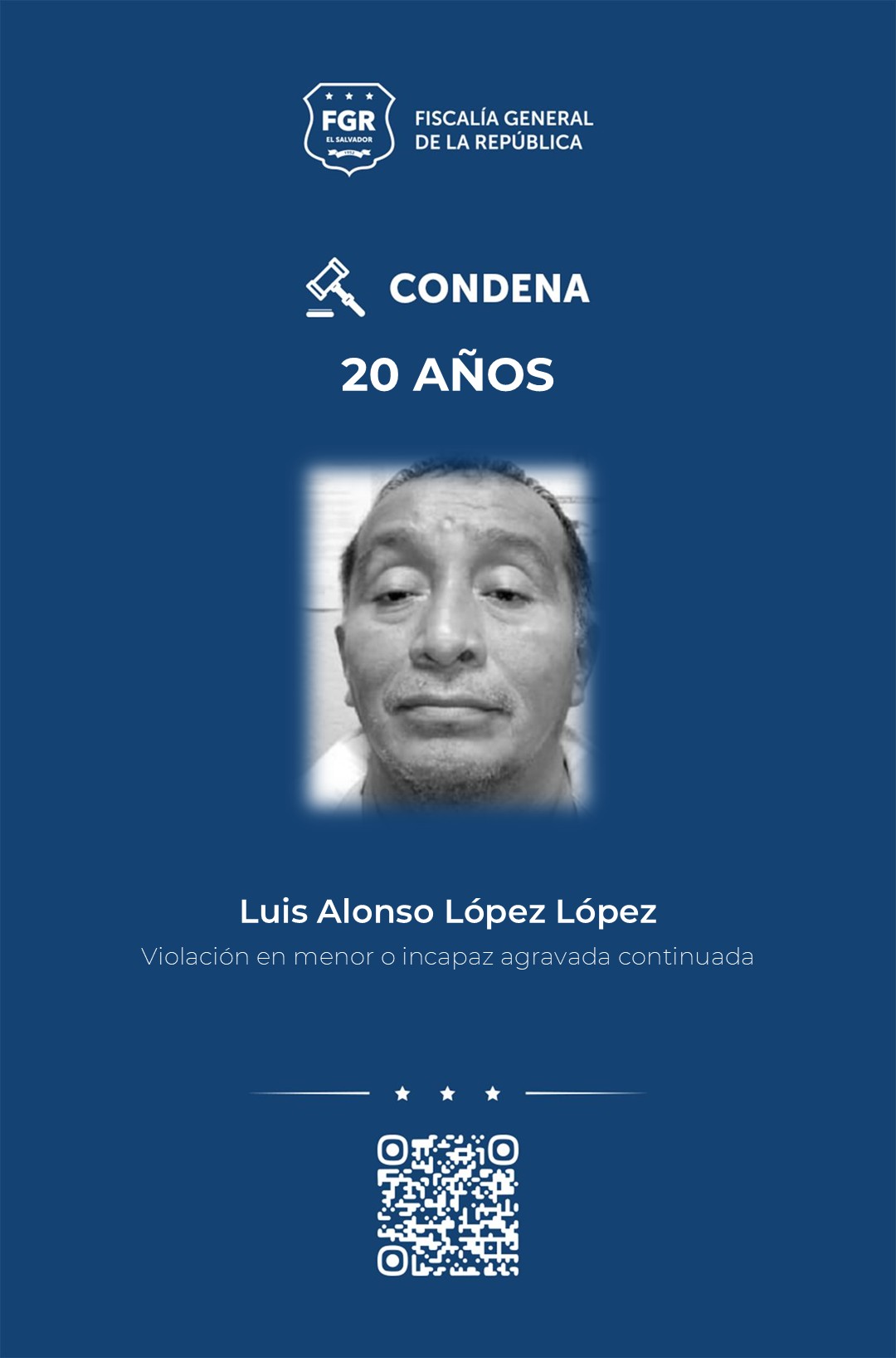 Morazán. Gracias a las pruebas presentadas en juicio por la Fiscalía, Luis Alonso López López fue condenado a 20 años de prisión por haber violado a una menor de edad; esa misma pena también fue impuesta a Luisa Verónica Cruz Andrade, quien explotó sexualmente a la víctima entre 2017 y 2018,.