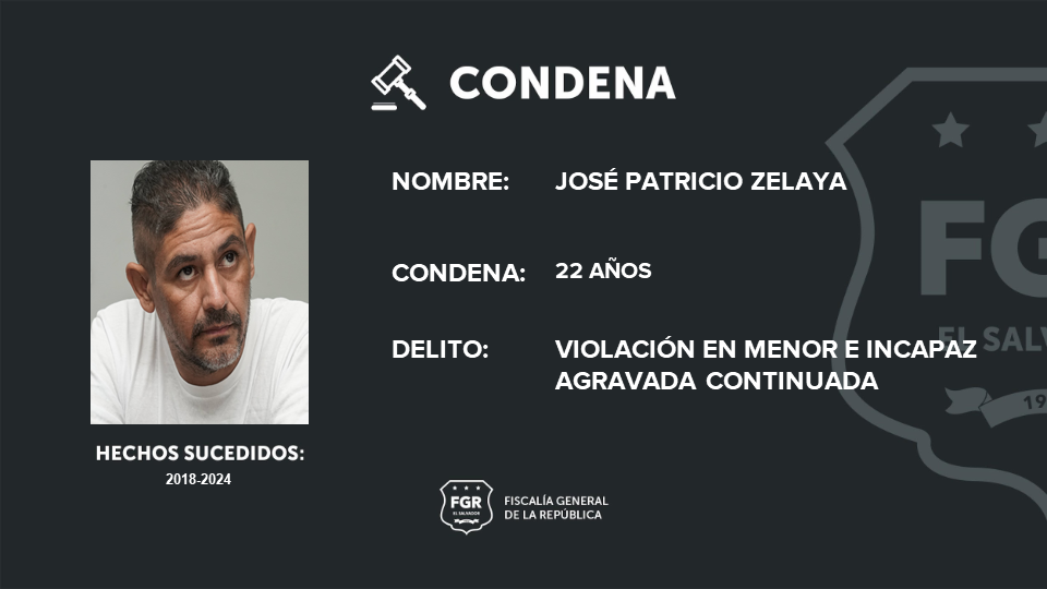 Santa Tecla, La Libertad Sur. La Fiscalía General de la República (FGR) logró que José Patricio Zelaya fuera sentenciado a 22 años de prisión por el delito de violación en menor e incapaz agravada en modalidad continuada.
