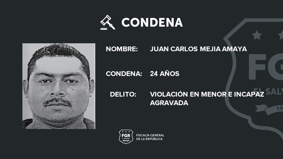 Santa Tecla. La Fiscalía General de la República (FGR) sigue obteniendo penas ejemplares de prisión para abusadores sexuales, y logró que Juan Carlos Mejía Amaya fuera condenado a 24 años de cárcel por haber violado a una niña de 10 años en Lourdes Colón, La Libertad.