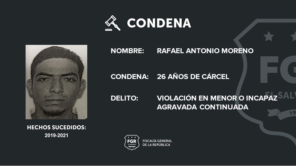 Zaragoza, La Libertad Este. La Fiscalía General de la República (FGR) logró hacer justicia a favor de una niña de 13 años, quien fue violada por Rafael Antonio Moreno. El imputado fue sentenciado a 26 años de prisión.