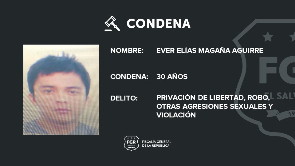 La FGR logró comprobar e individualizar la culpabilidad de cada uno los sujetos y el Tribunal Segundo de Sentencia de Santa Ana impuso 30 años de cárcel para Ever Elías Magaña Aguirre, de los cuales, 5 años de prisión son por el delito de privación de libertad, 7 años por robo, 8 años por otras agresiones sexuales y 10 años por el delito de violación. Además, el juzgador le ordenó que debe pagar a la víctima $440 dólares.