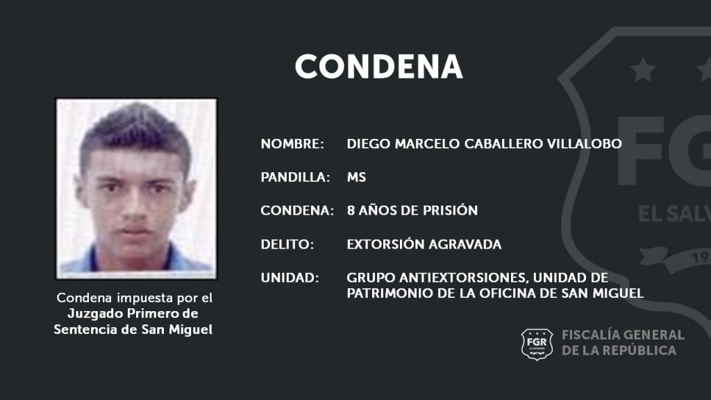 San Miguel.  El integrante de la MS, Diego Marcelo Caballero Villalobo se declaró responsable de haber recibido dinero, exigido con amenazas a muerte, por lo qur recibió una pena de cárcel de 8 años. Así lo aseguraron Fiscales del grupo Antiextorsiones de la oficina de San Miguel.