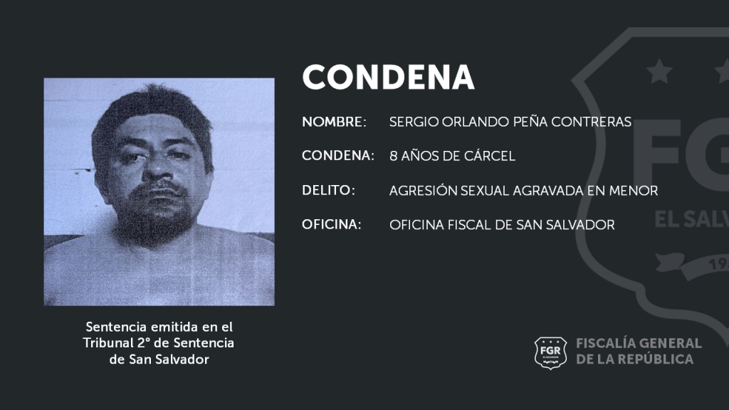 San Salvador. La Unidad de Atención Especializada Para la Mujer, Niñez y Adolescencia de la sede fiscal de San Salvador logró que a Sergio Orlando Peña Contreras se le impusiera una condena de 8 años de prisión por el delito de Agresión Sexual Agravada en Menor.