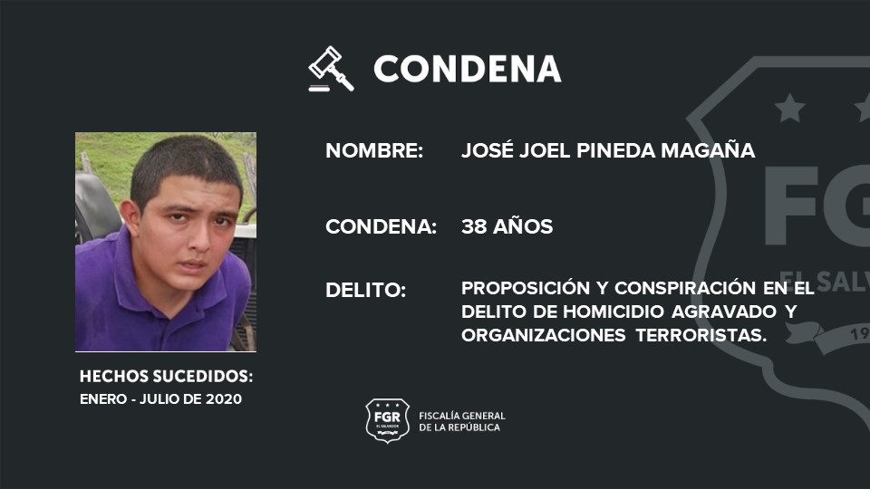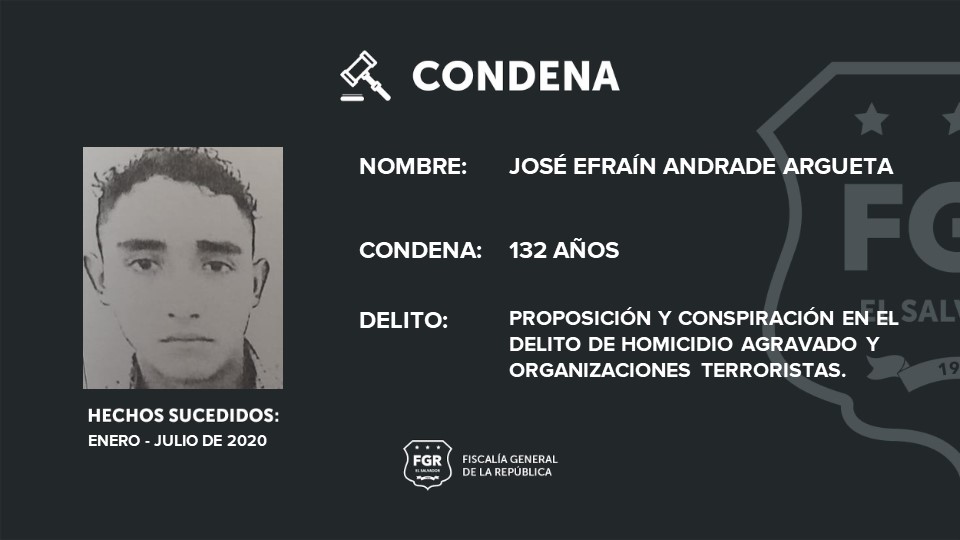 José Efraín Andrade Argueta (homeboy) , fue sentenciado a 132 años de prisión por 6 casos de proposición y conspiración en el delito de homicidio agravado y organizaciones terroristas y José Joel Pineda Magaña (homeboy), fue sentenciado a 38 años de cárcel.