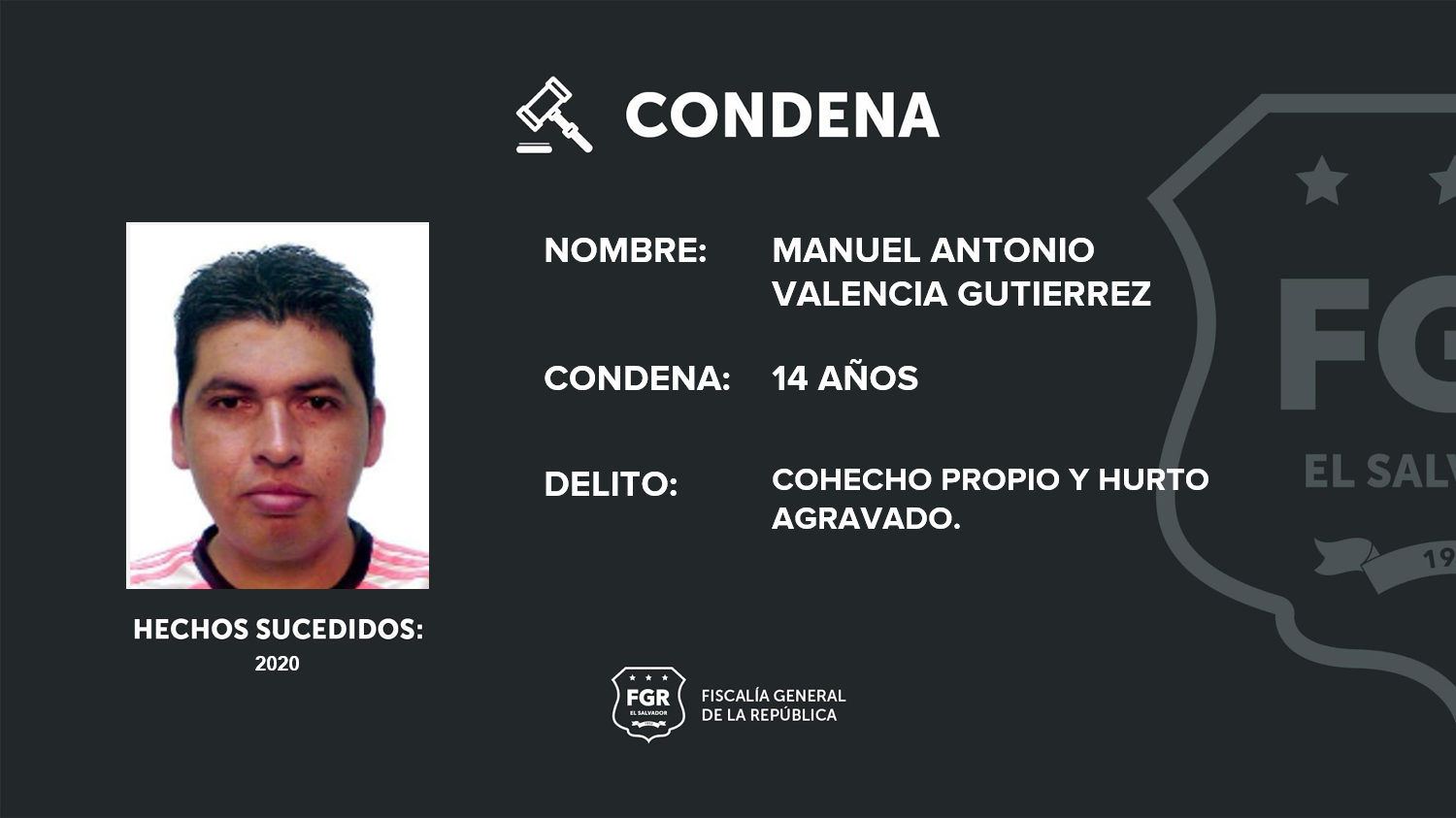 Sonsonate. La Fiscalía logró que los expolicías, Jorge Arturo Agreda Guinea y Manuel Antonio Valencia Gutiérrez, sean condenados a 20 y 14 años de prisión por exigir dinero a sus víctimas bajo amenazas o represalias y por hurtar pertenecías de sus víctimas. Los imputados operaban en el municipio de Cuisnahuat, Sonsonate Este.