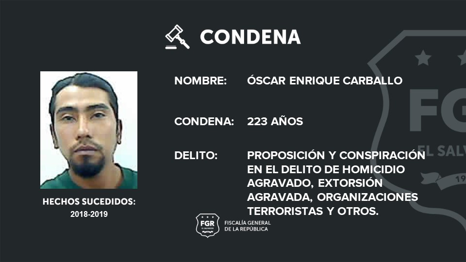 Mientras que Óscar Enrique Carballo Fernández, deberá cumplir 223 años de prisión por 12 casos de proposición y conspiración en el delito de homicidio agravado en perjuicio de 17 víctimas; extorsión agravada; actos preparatorios, proposición, conspiración y asociaciones delictivas de intento de homicidio.