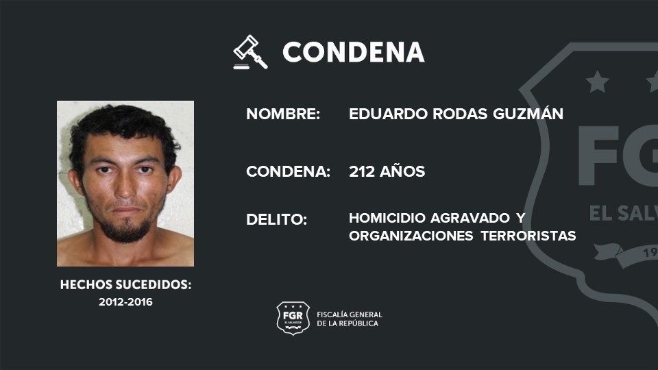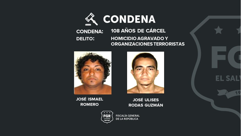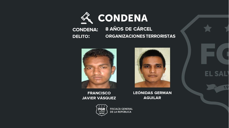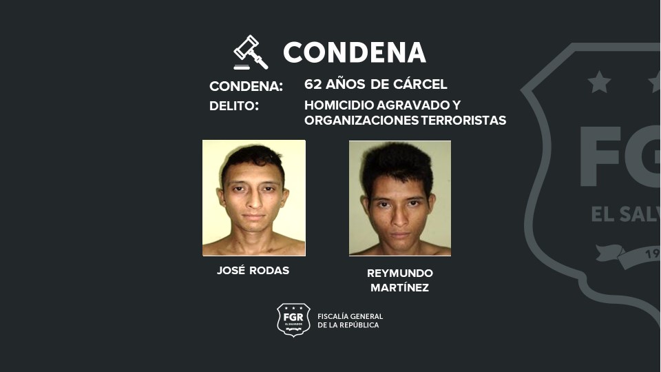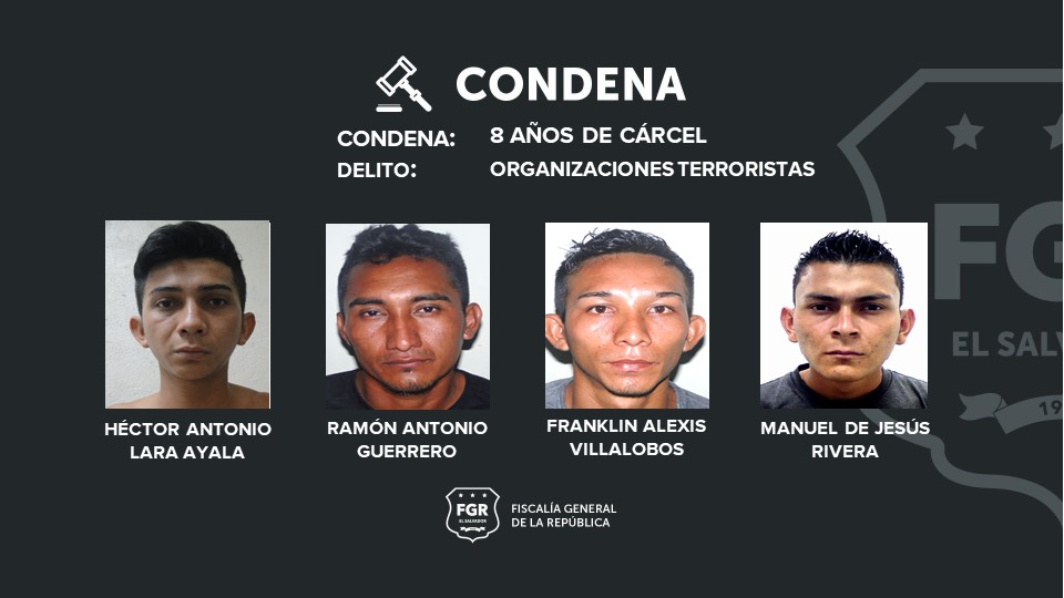 José Rodas Vaquerano y Reynaldo Isael Martínez Meléndez, fueron condenados a 62 de cárcel, Luis Alonso Santana Guerrero, a 58 años; mientras que Gerson Bladimir Aguilar Márquez y Énoc Alexander Mejía fueron sentenciados a 12 años de prisión, respectivamente, por organizaciones terroristas